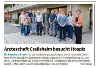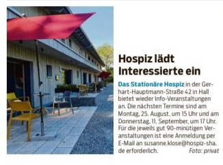 Info-Veranstaltung für die interessierte Öffentlichkeit mit der Möglichkeit zur Besichtigung eines Teils der Räumlichkeiten. Anmeldung erforderlich unter susanne.klose@hospiz-sha.de oder 0176-47330434.